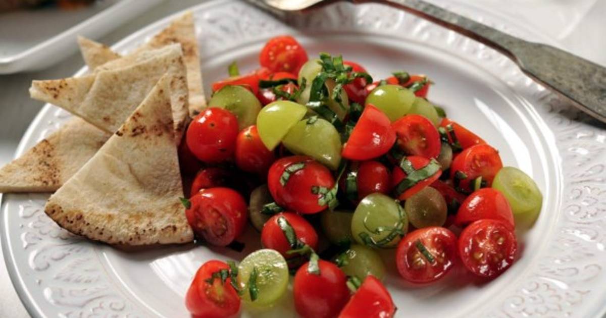 Cortar los tomates y uvas por la mitad. Aparte, picar las hojas de albahaca. Mezclar todos los ingredientes en un tazón y servir la ensalada acompañada de pan pita.