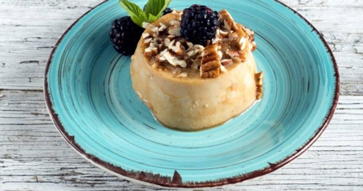 Licuar todos los ingredientes. Verter la mezcla en moldes individuales, tapar con papel aluminio y cocer a baño María. Dejar enfriar, desmoldar y servir con nueces picadas y frutas frescas.