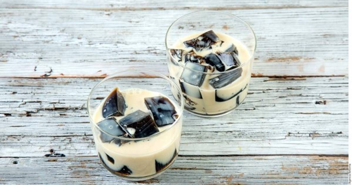 Colocar el café a fuego medio, agregar la grenetina y disolver. Verter la gelatina en un molde y refrigerar hasta que cuaje. Cortar la gelatina en cubos y reservar. Combinar, aparte, las leches con la vainilla. Combinar la gelatina con la leche y servir.
