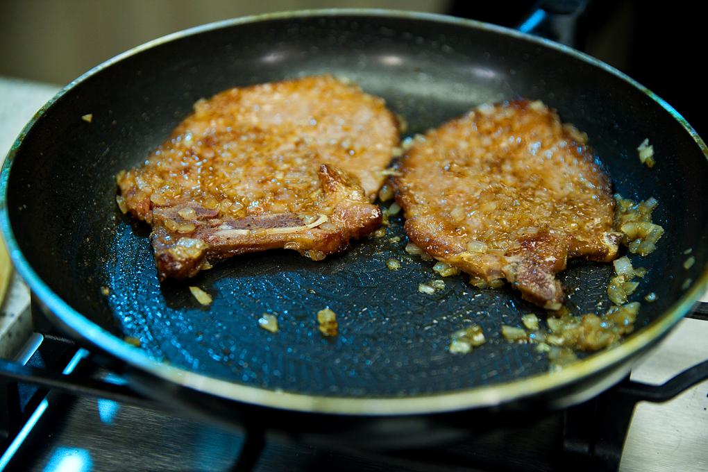3. Bajar a fuego medio y añadir la cebolla finamente picada, luego la jalea para cubrir las chuletas y cocinar durante 5 minutos.
