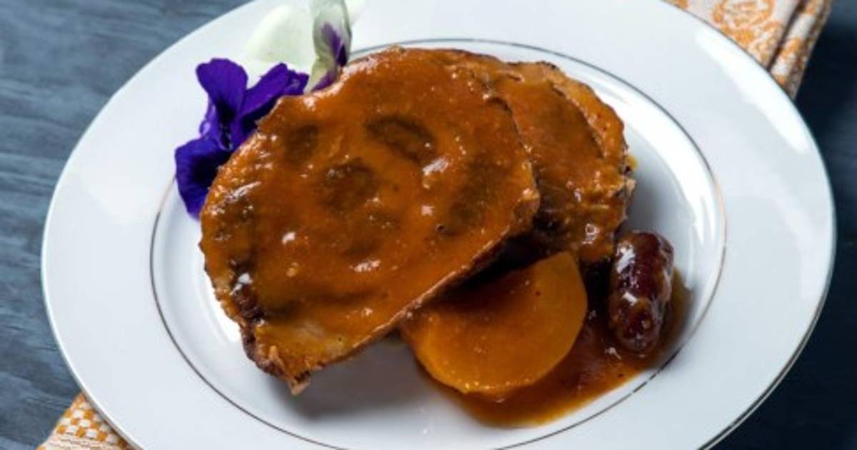 Licuar los duraznos, los dátiles, la mostaza, el caldo, la sal y la pimienta. Colocar en una charola de horno con la salsa y hornear por 50 minutos a 200 °C.