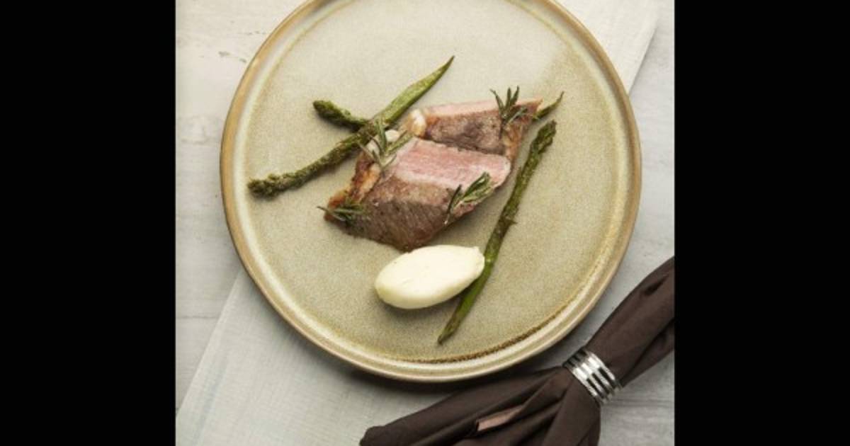 New York con puré de papa y espárragos