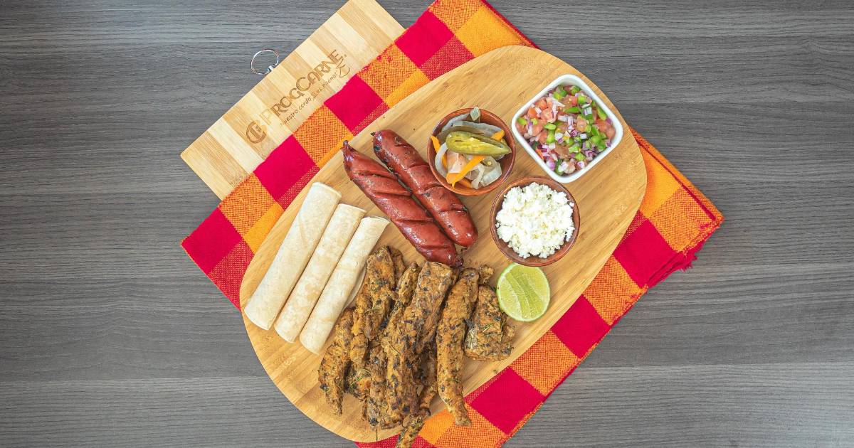 6/ Servir la carne de asar de cerdo con los chorizos, la cuajada, chismol, encurtido y tortillas.