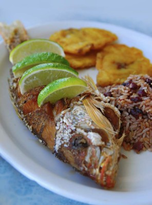 Preparación: Limpiar el pescado por dentro y fuera. Condimentarlo con sal y pimienta. Luego pasarlo por la harina y freír en abundante aceite bien caliente. Servir con arroz y frijoles en coco y tostones de plátano verde.