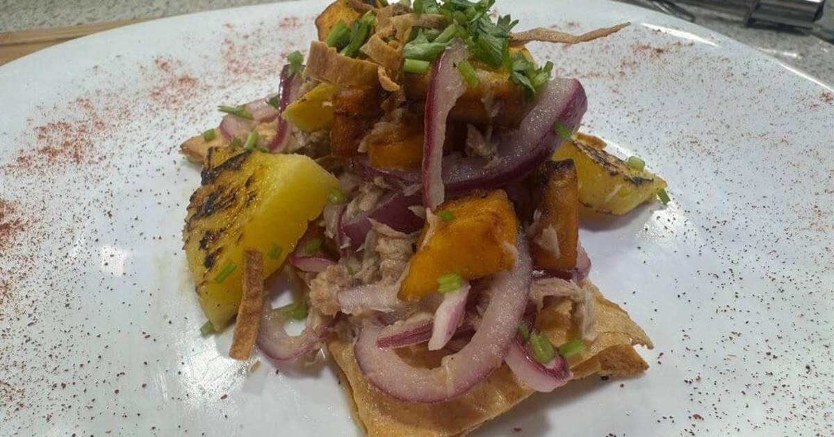Cortar la piña en rodajas delgadas y asarla a fuego medio hasta que esté dorada.Para emplatar, colocar una tortilla tostada como base, agregar el ceviche, y coronar con una rodaja de aguacate y piña asada.