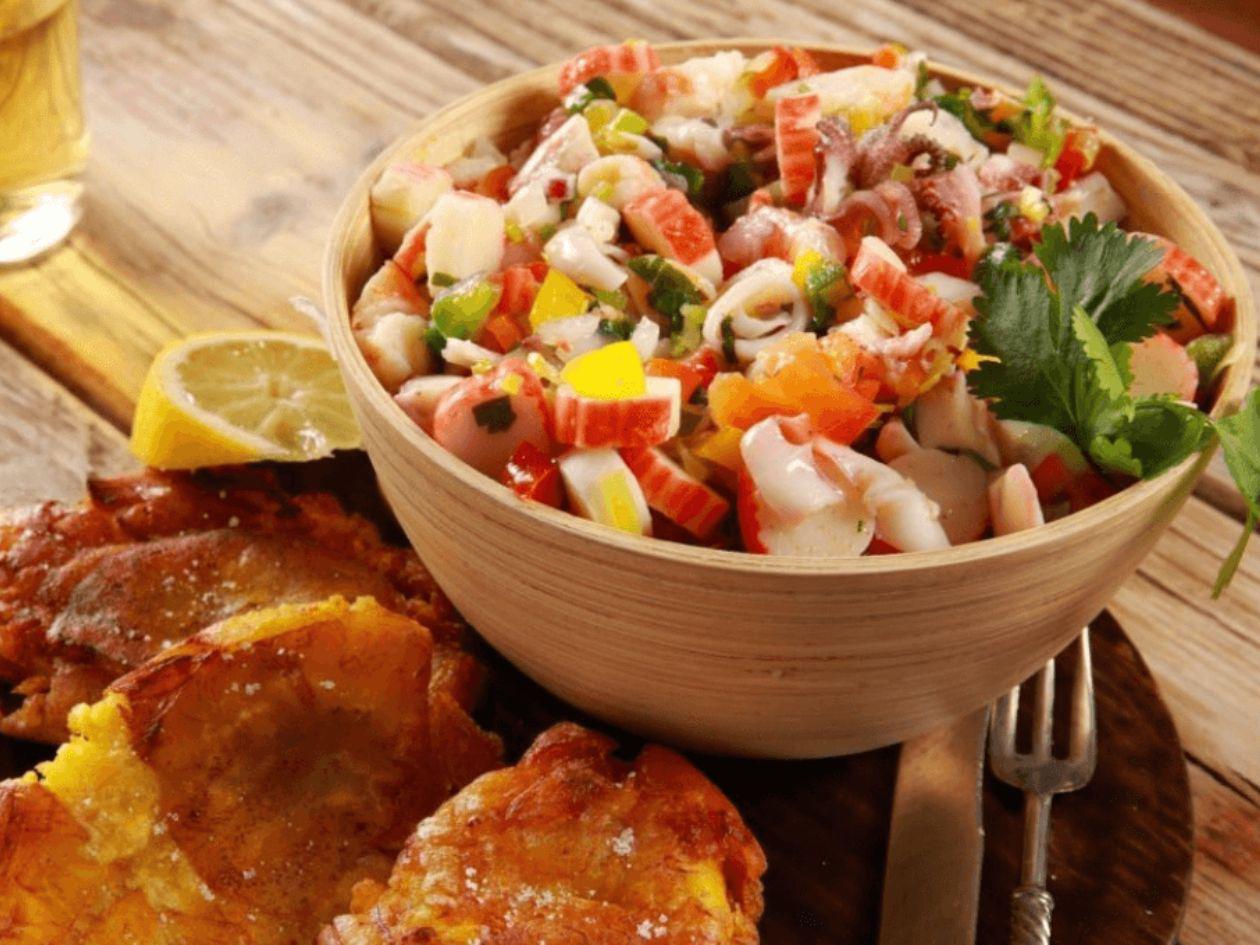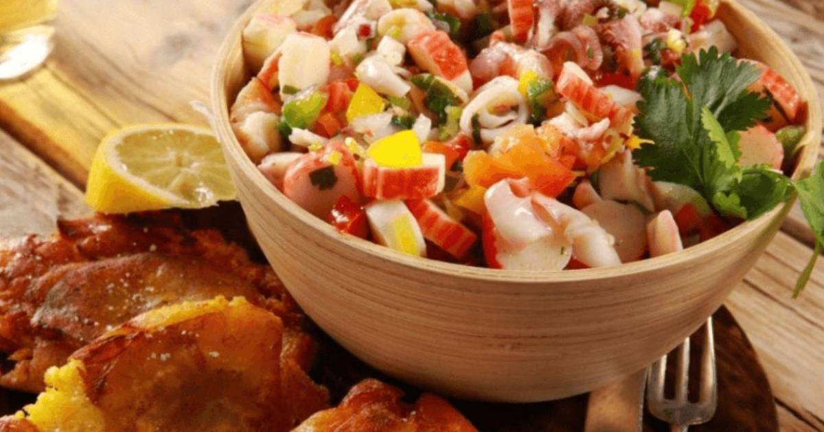 Ingredientes: 1 libra de caracol limpio, 1 plátano verde, 1/2 plátano maduro, 2 tazas de caldo de pescado, 3 cucharadas de aceite vegetal, 1 cebolla amarilla finamente picada, 1 cucharadita de achiote en polvo, 2 dientes de ajo finamente picados, 1/2 mazo de cilantro finamente picado, 1 taza de leche de coco y sal y pimienta.