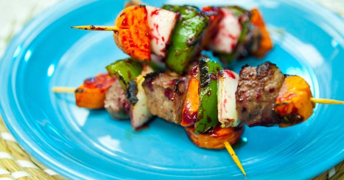 Pinchos de res con salsa teriyaki de mora