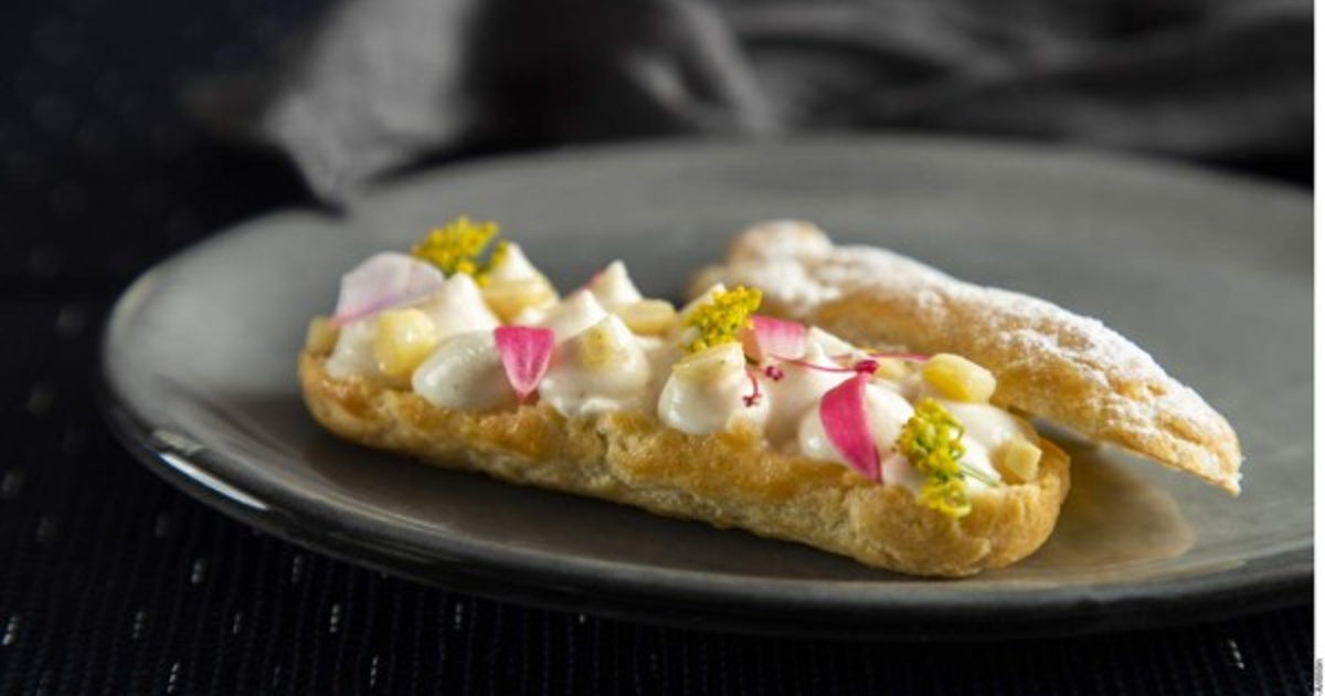 2. Coloque en la batidora e incorpore los huevos uno a uno. Vierta la masa en una manga con duya y forme los éclairs sobre una charola forrada con papel encerado. Hornee a 200 °C hasta dorar.