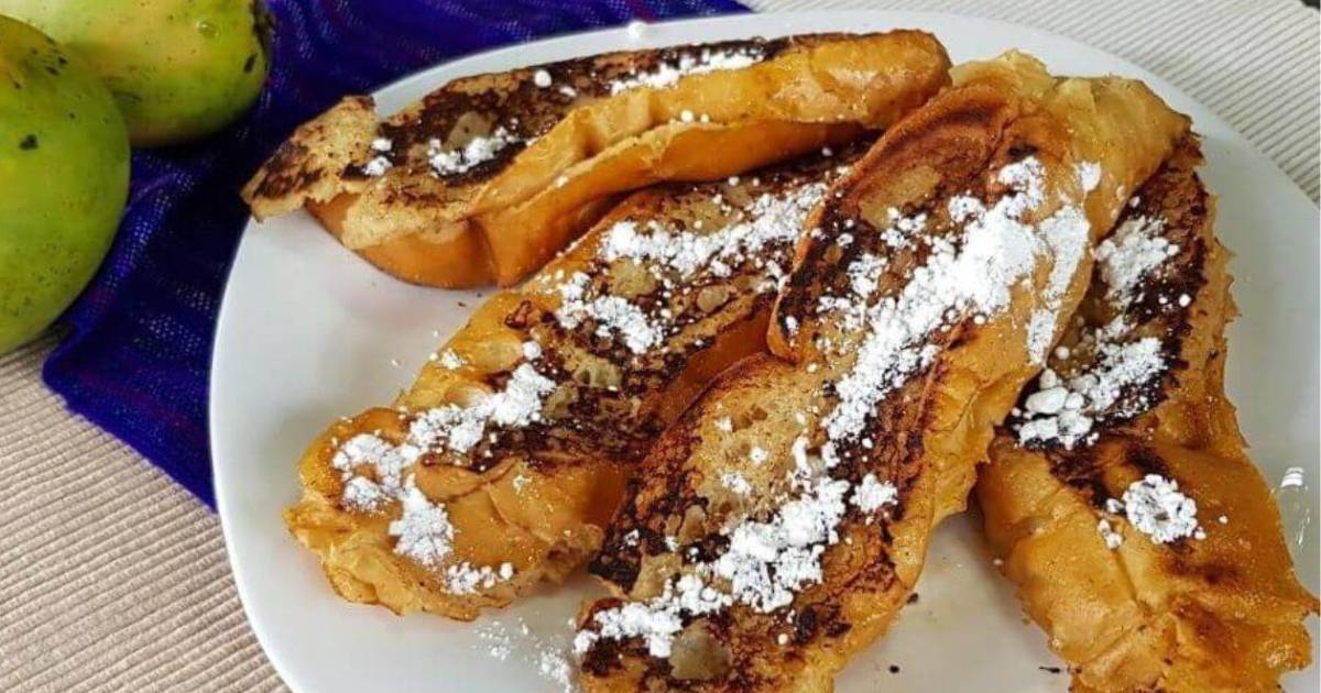 Ingredientes: 1 pan baguette, ½ taza de jalea de mango, 3 huevos, 1½ taza de leche, 1 cucharadita de canela, 1 cucharadita de pimienta gorda en polvo, ½ shot de ron, 1 pizca de clavo de olor, ½ barra de mantequilla amarilla.