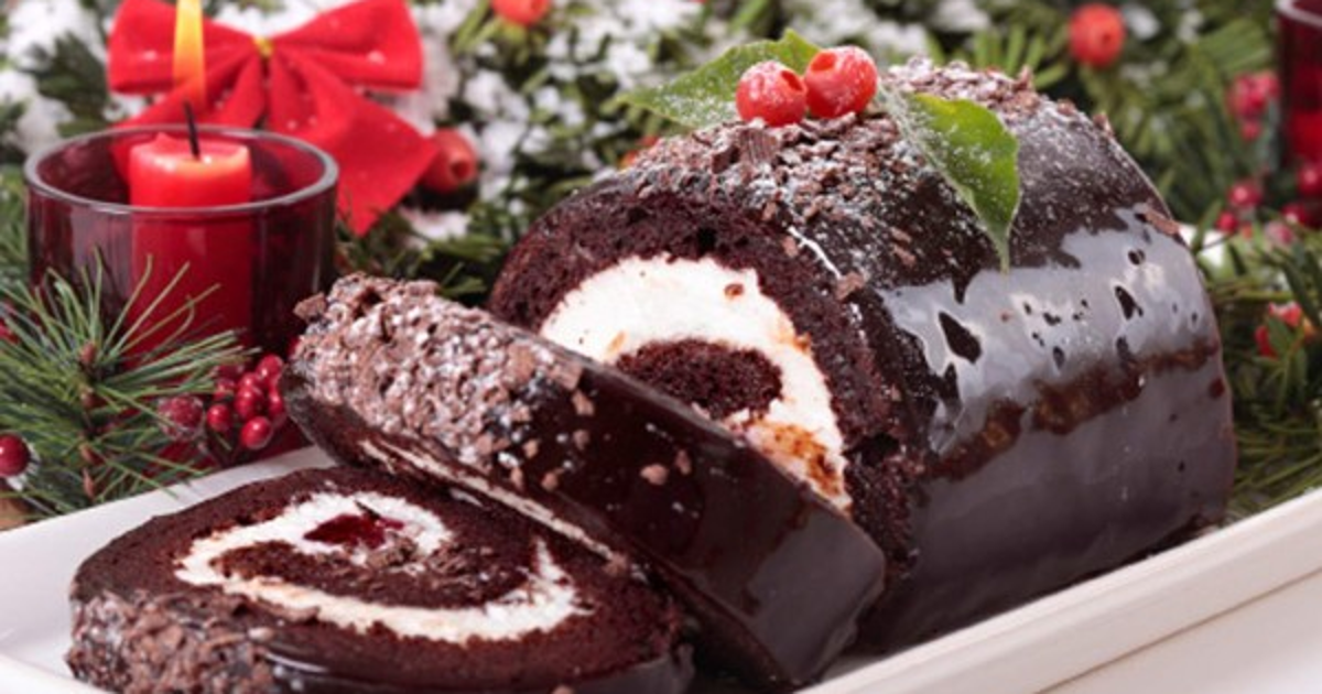 Batir la crema hasta picos firmes y refrigerar 30 minutos. Espolvorear azúcar glas sobre papel encerado y voltear el pastel, retirar el papel y extender una capa ligera de salsa de chocolate; sobre esto, extender la crema batida. Enrollar la preparación con el papel encerado, procurando que quede bien apretado. Extender el resto de la salsa de chocolate sobre el rollo y con la ayuda de un tenedor formar las marcas de un tronco. Dejar enfriar en la nevera durante 30 minutos, decorar con las cerezas y rociar un poco de azúcar glas.