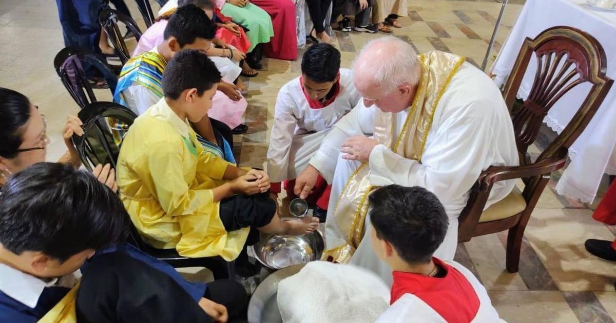 Al finalizar la eucaristía, monseñor Lenihan realizó el lavatorio de pies a 12 niños recordando el gesto de Jesús con sus discípulos.