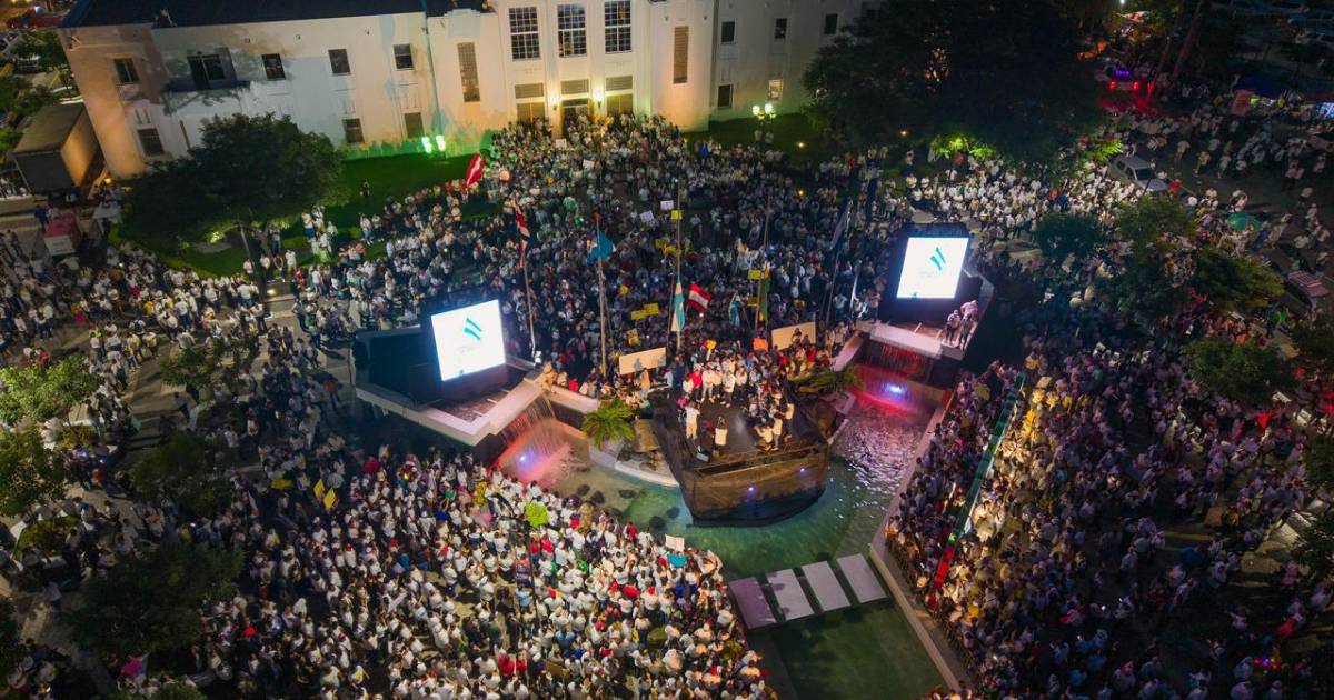 Ataviados con camisas blancas, banderas rojas y figuras de pollos, unas cuatro mil personas apoyandoon al edil ya los funcionarios que están tras las rejas por la denunciada persecución política.