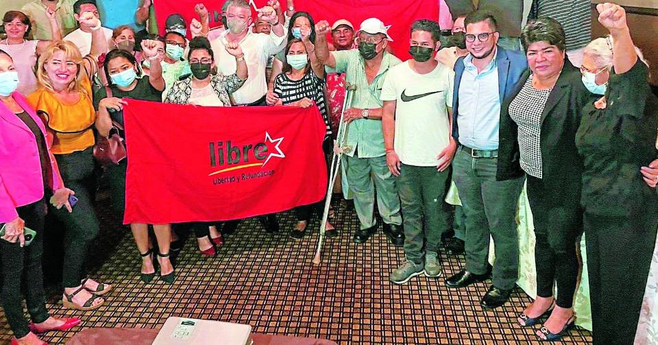Roberto Mena, Hidelgardo Paz y José Luis Aguirre comparecieron junto con el vicealcalde Omar Menjívar y un grupo de activistas de Libre.