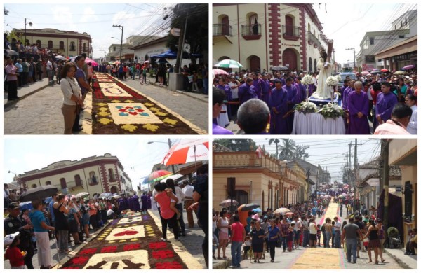Fueron decenas de feligreses los que desde las 4:30 de la mañana madrugaron a elaborar coloridas alfombras para hacer del extenso recorrido que inició a las 9:00 de la mañana desde la iglesia Catedral hasta el auditorio Monseñor Carranza Chevez, donde culminó con una misa.