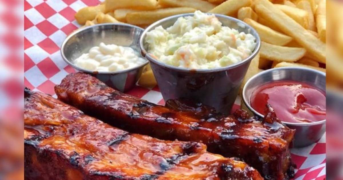 Las deliciosas costillas ahumadas se acompañan de papas fritas sazonadas, ensalada coleslaw, y una variedad de salsas y aderezos, que terminan siendo devoradas por todos los clientes.