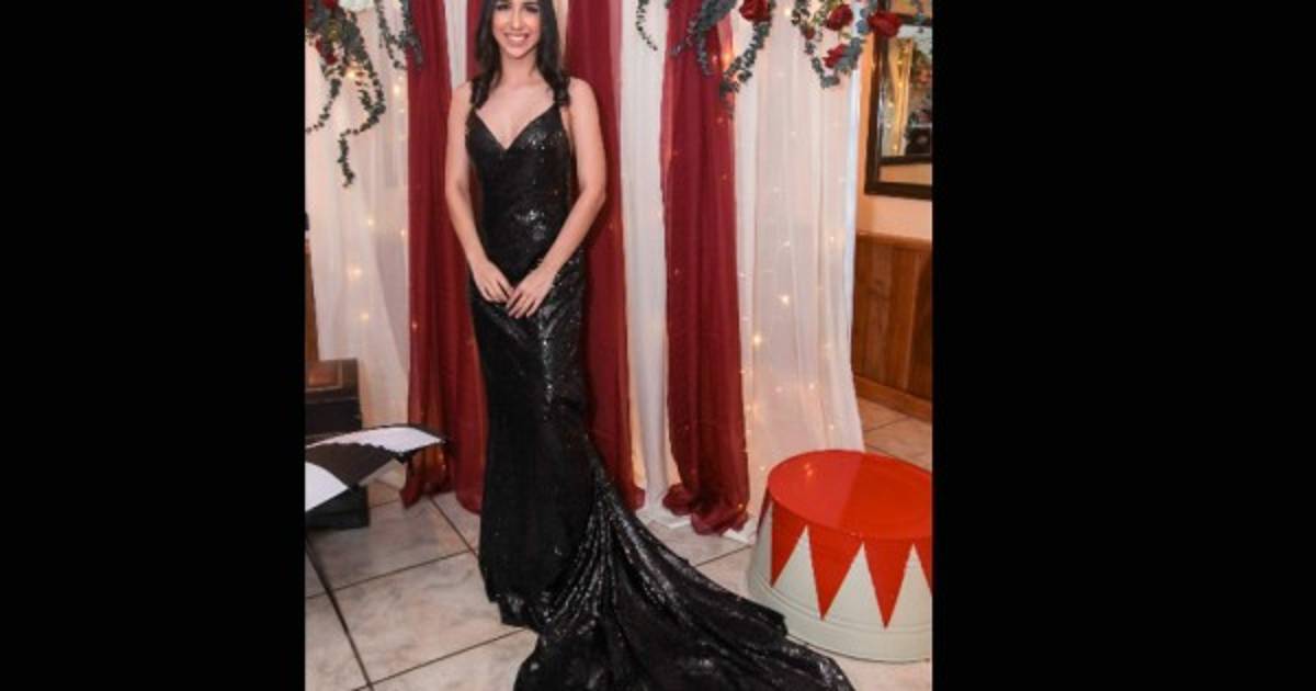 Hanna lució un hermoso vestido negro brillante de lentejuelas estilo glasgow sin mangas, corte sirena y cola, con un escote en la espalda que además destacaba por ser un vestido entallado. En su peinado la adornaba una hermosa corona dorada con detalles en perlas negras y blancas.