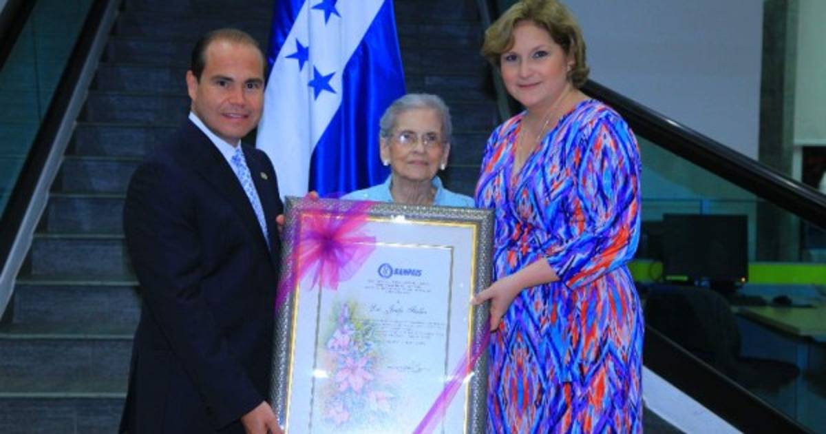 La distinguida dama Josefa Fiallos es honrada por el comité auxiliar de la Liga contra el Cáncer como la abanderada del Programa Cívico Permanente de Banpaís.