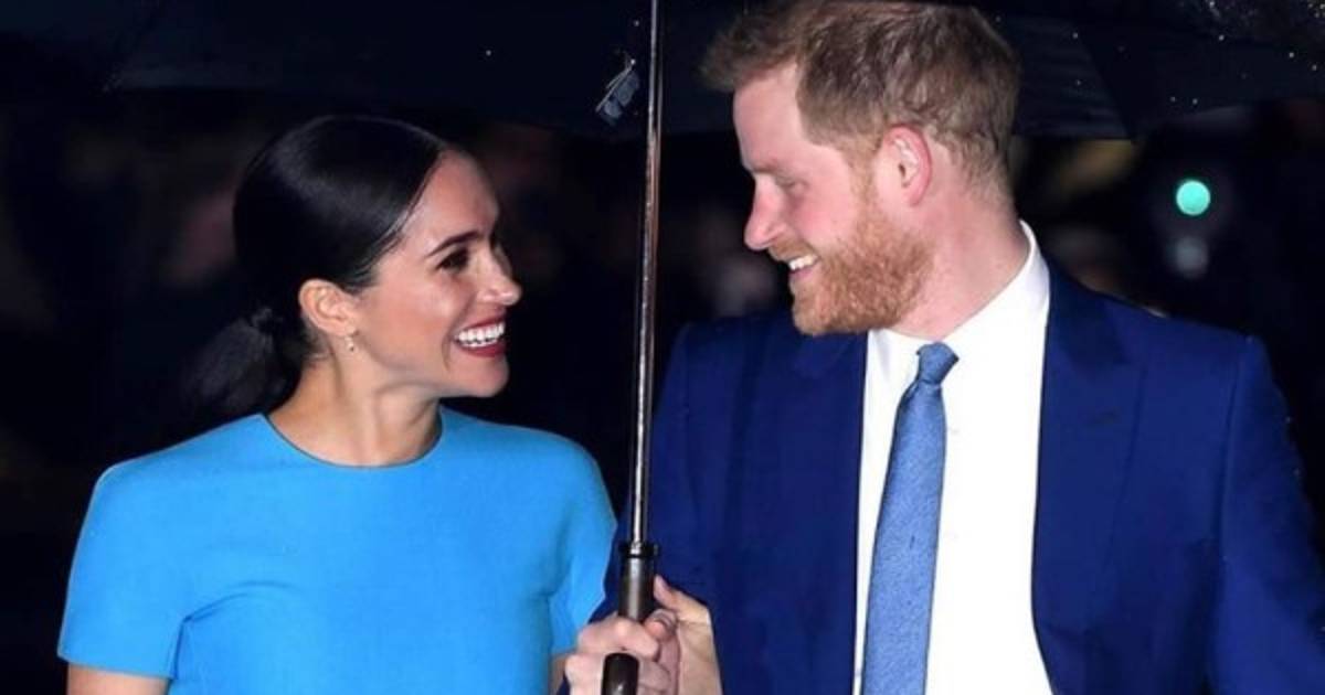 Refugiados bajo un paraguas, Harry vestía un traje azul oscuro, camisa blanca y corbata azul, mientras que la ex actriz estadounidense lució un vestido azul de la diseñadora británica Victoria Beckham.