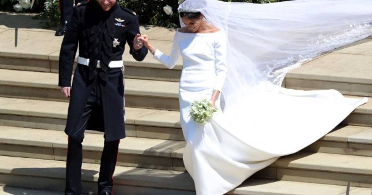 Markle lució un diseño muy sencillo, blanco inmaculado con escote de cuello de barco y cubrió su rostro con un velo transparente, adornado con bordados en los bordes hechos de organza y con una cola de cinco metros de longitud.