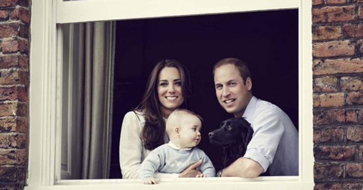 La duquesa, de 32 años, sonriente, lleva en brazos al pequeño príncipe, que a su vez observa al perro de la familia, Lupo, un cocker spaniel negro, sentado en las rodillas del duque.