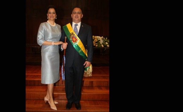 Fue la propia esposa de Armando Calidonio, la dama Karen Stechmann, quien le colocó la banda que lo acredita como alcalde y no faltó el bastón de mando que levantó por segunda ocasión en su vida con total orgullo.