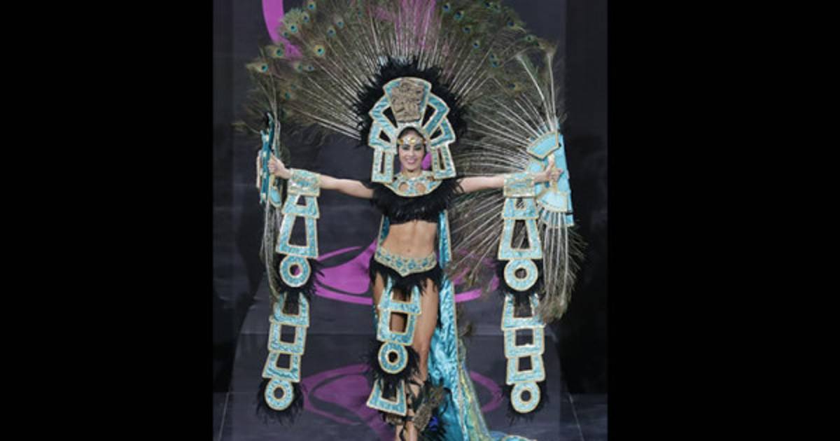La alegoría brilla por más de 1,500 piedras acrílicas en tonos amarillo y turquesa, “enmarcado con lentejuela dorada cada una de las formas del traje, logrando un sutil destello de brillo con diminutas piedras acrílicas en color amarillo”, confirma el creador. Además un abundante plumaje negro da sobriedad y permite destacar las 210 plumas de pavo real, ave venerada por los mayas, con las cuales está coronado el atuendo.