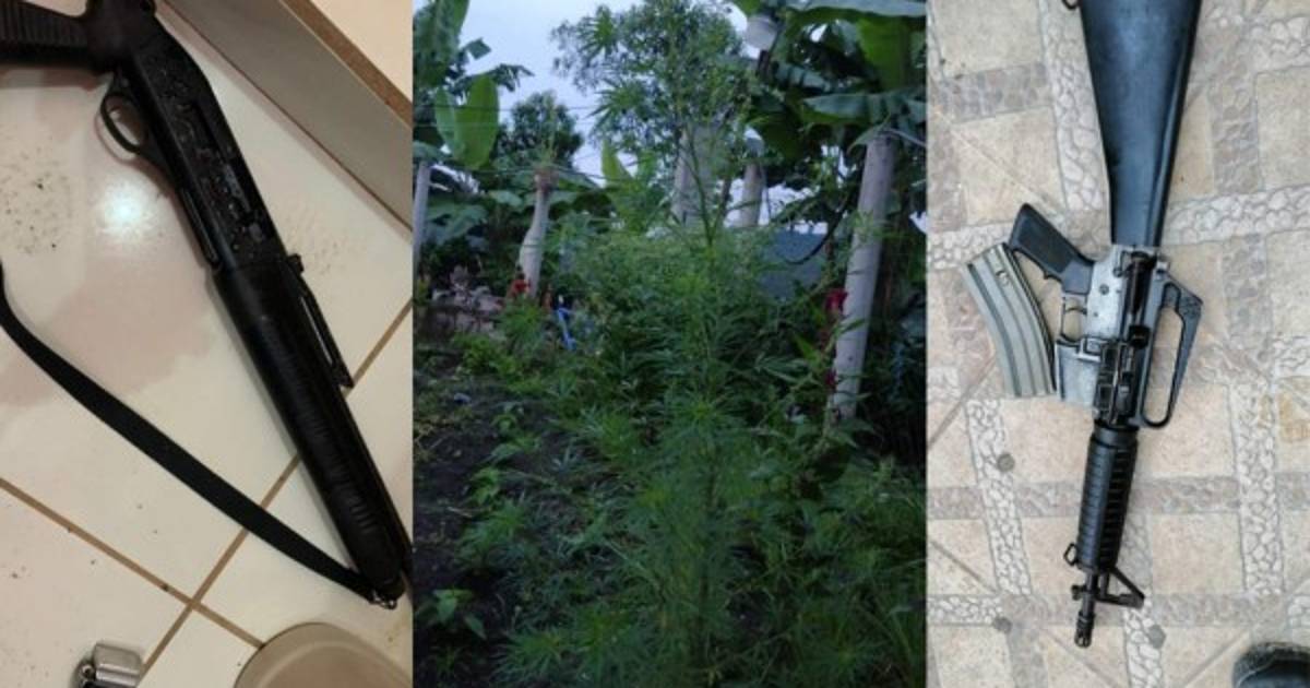A los presuntos delincuentes también les decomisaron un fusil AR-15 con la serie borrada, una escopeta, una pistola Prieto Beretta, 112 cartuchos calibre 5.56 milímetros, 85 cartuchos para escopeta, 100 cartuchos para pistola calibre 9 milímetros y una planta de supuesta marihuana.
