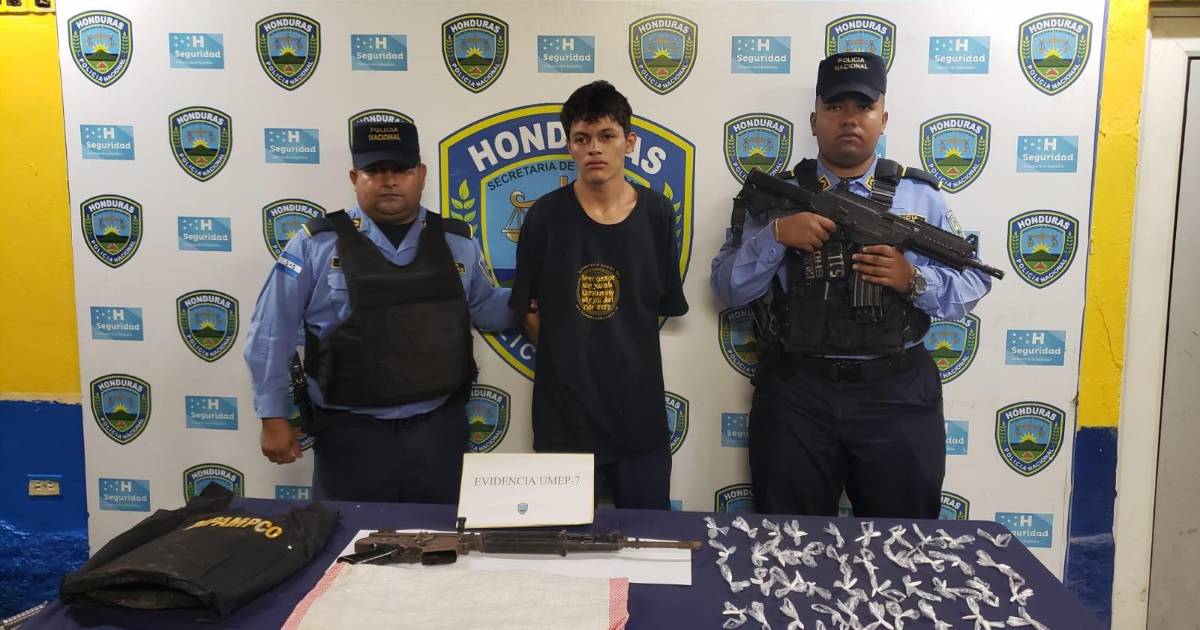 El capturado responde al nombre de Franklin Josué Valle Ramírez (de 21 años) a quien le decomisaron un fusil tipo CAL calibre 5.56 mm de uso militar, un chaleco de fabricación artesanal con inscripciones falsificadas de la Dipampco y una bolsa plástica donde transportaba 50 puntas de polvo blanco cocaína.