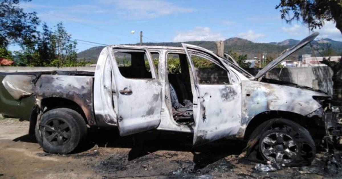 Las autoridades notificaron que el vehículo doble cabina, de color verde y placas PDD0293, estaba incendiado en la residencial Rosa María, municipio de La Esperanza, por lo que llamaron al Cuerpo de Bomberos para las labores de control y extinción total.