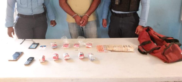 A Burgos Gaitán le decomisaron nueve paquetes de supuesta marihuana, más de dos mil lempiras en distintas denominaciones, dos celulares y una motocicleta azul.