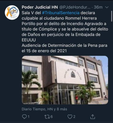 Un Tribunal de Sentencia de la Corte Suprema de Justicia declaró culpable este viernes al profesor Rommel Herrera Portillo por el delito de incendio agravado a título de cómplice en perjuicio de la embajada estadounidense en Tegucigalpa durante protestas en 2019.