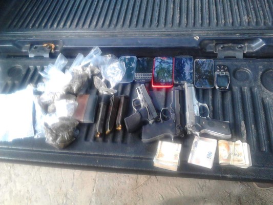 A los detenidos les decomisaron tres pistolas calibre nueve milímetros con sus respectivos cargadores, dos motocicletas, seis teléfonos celulares, 30 proyectiles nueve milímetros, 27 piedras de crack envueltas en blíster para su comercialización, 20 mil lempiras y una lista de personas a quienes los capturados extorsionaban.