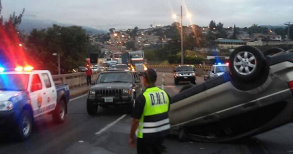 Una camioneta se dio vuelta hoy sobre el carril que viene de la Corte Suprema de Justicia hacia un centro comercial en el sector de los puentes en la colonia Las Brisas de Tegucigalpa.