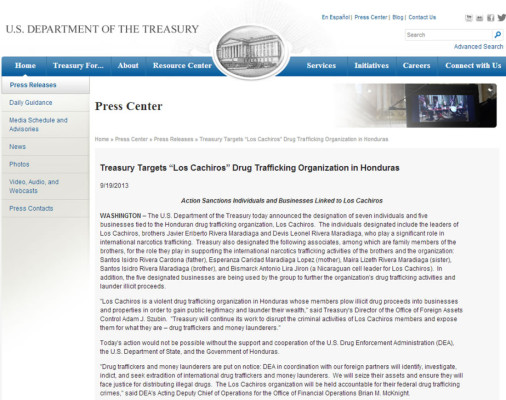 'El Departamento del Tesoro anunció hoy la designación de siete individuos y cinco empresas ligadas a la organización de tráfico de drogas hondureña, Los Cachiros. Los individuos designados incluyen los líderes de Los Cachiros, los hermanos Javier Eriberto Rivera Maradiaga y Devis Leonel Rivera Maradiaga, quienes juegan un papel importante en el tráfico internacional de narcóticos.