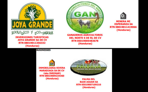 Las empresas familiares identificadas incluyen: Ganaderos Agricultores del Norte, S. de R.L. de C.V; Palma del Bajo Aguan, S.A.; Minera Mi Esperanza, S.A.; Inmobiliaria Rivera Maradiaga, S.A. de C.V; e Inversiones Turísticas Joya Grande, S.A. de C.V.
