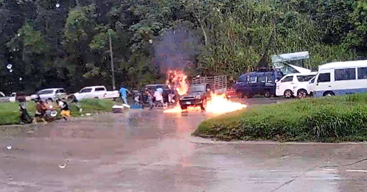 El momento exacto en que se incendia un vehículo tipo pick up fue grabado por las cámaras de video de la zona a la altura del sector El Chile de Puerto Cortés, en la zona norte de Honduras.