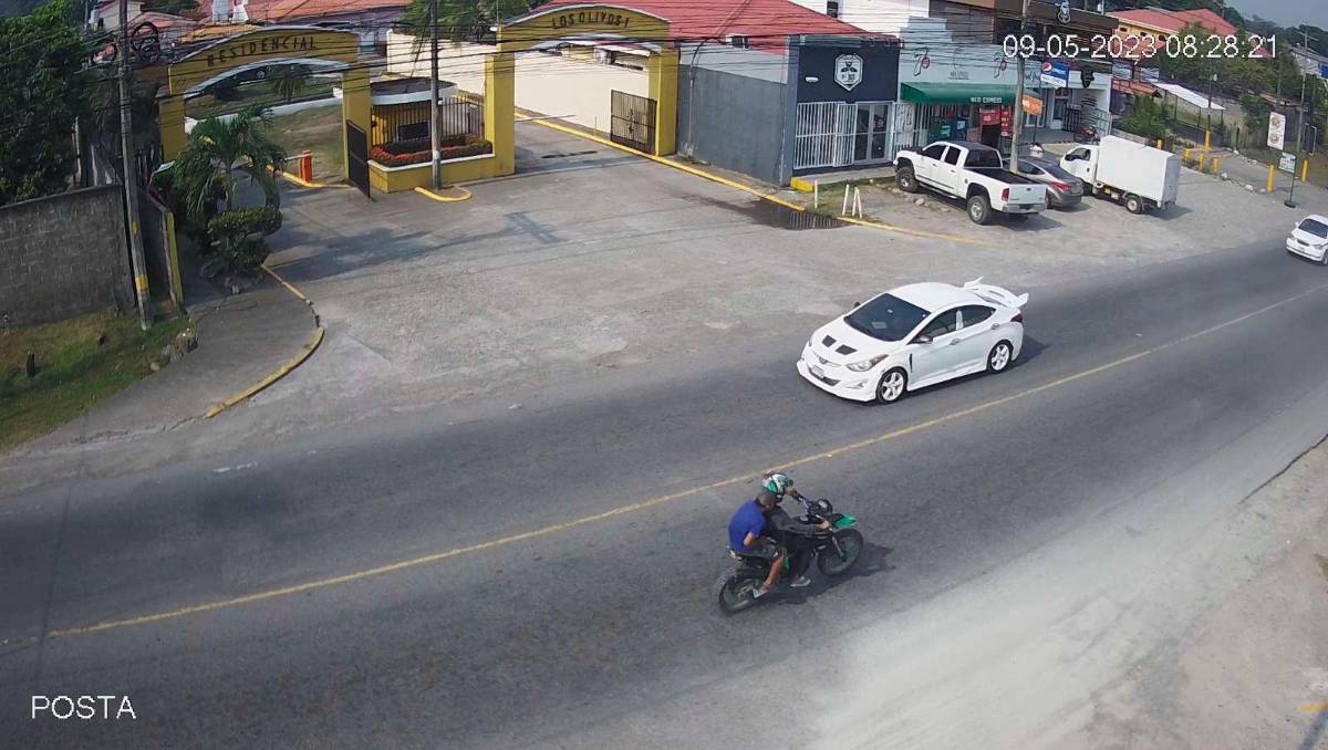 Cámaras de vigilancia captaron el momento que dos hombres escapaban en una motocicleta, minutos después de atacar a balazos a una mujer que se conducía en un vehículo tipo pick up Mitsubishi con placa P-AE 2548.