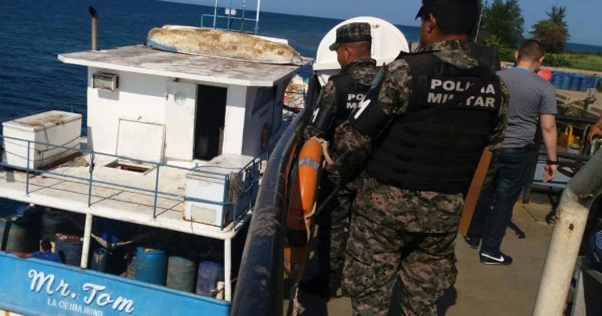 El barco es inspeccionado por efectivos de la Fuerza Naval de Honduras junto a agentes de la Dirección de Lucha Contra el Narcotráfico (Dlcn).