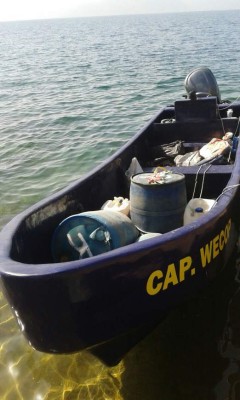 La embarcación Capitán Wecop, tipo tiburonera de 28 pies de eslora, con un motor fuera de borda, color morado, fue capturada en la posición 155220 norte y 0853102 oeste frente a la barra de la comunidad garífuna de Limón.