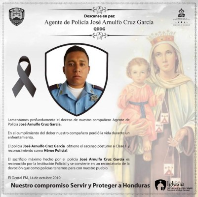 Nota de duelo por parte de la Policía Nacional sobre el agente asesinado.