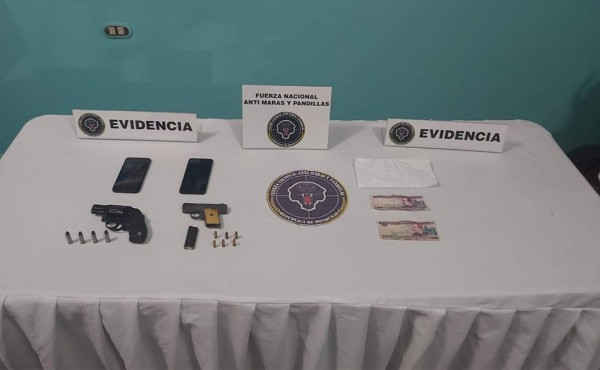 - Un sobre de color blanco, conteniendo 1,000 lempiras previamente seriados y simulando la cantidad de 10,000 lempiras producto del cobro de extorsión.- Un arma de fuego tipo revolver, calibre 38