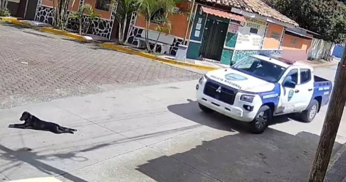 Imágenes captadas por un comercio local muestran el momento en el que la patrulla que conducían los elementos policiales pasan rápidamente sobre el animal.