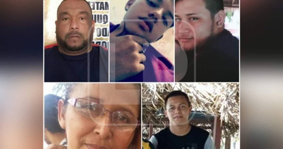 Se trata de Jacob Stivi Torres Núñez (16), de oficio estudiante; Juan Carlos Tinoco Núñez (45), de oficio contratista; Edwin Isaac Tinoco Núñez (36), de oficio contratista; Marta Graciela Bueso López (51), de oficio comerciante; Jorge Alberto Tinoco Bueso (22), de oficio operario; Brayan Mayorga y Santiago Alexander García Cálix (26), alias Sandía.