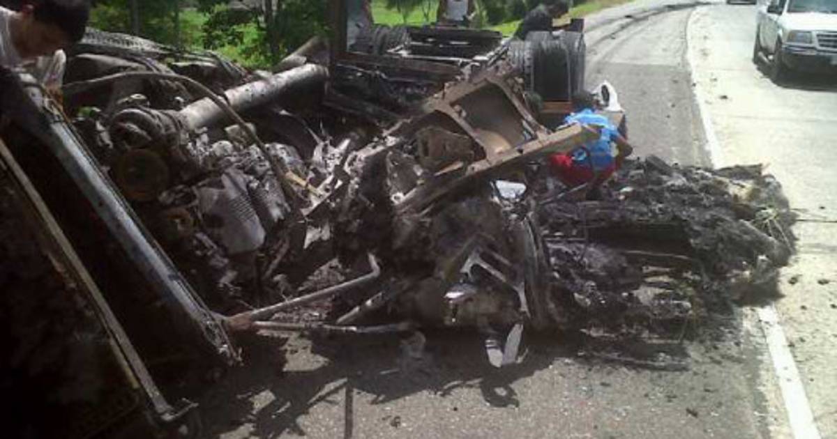 El hecho ocurrió a las 6:00 am de ayer, cuando el conductor de una camioneta roja, que supuestamente sufrió desperfectos mecánicos, perdió el control del vehículo y se estrelló contra el contenedor de una rastra en marcha. El fuerte impacto produjo una explosión que incendio la camioneta y parte del contenedor de una empresa distribuidora de frutas. El motorista del la camioneta resultó con lesiones, pero logró salir del carro en llamas. Bomberos de Puerto Cortés sofocaron las llamas y trasladaron al herido a un centro hospitalario.