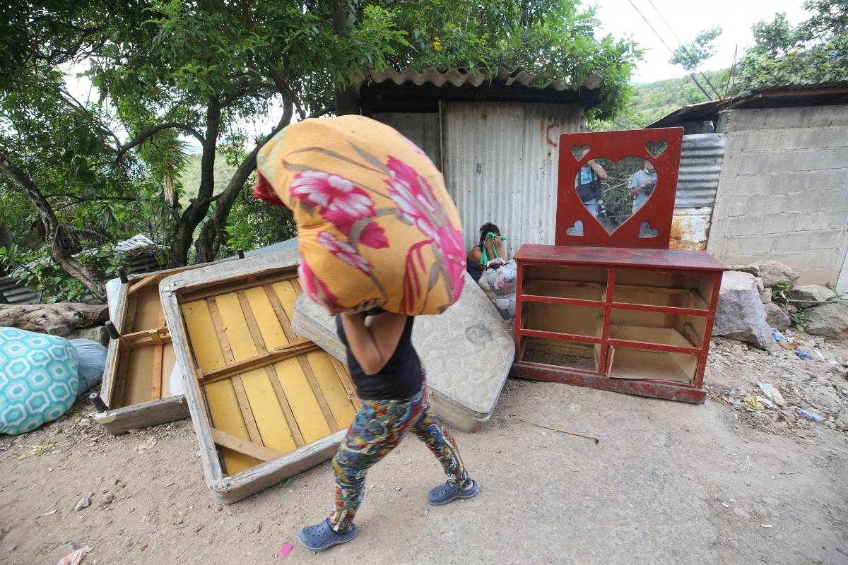 En los momentos que las veinte familias desalojaban las casas que construyeron de lámina de zinc, madera y algunas de material, miembros de la Policía Nacional y Policía Militar del Orden Público (PMOP) daban seguridad en los callejones que conectan el sector 2 de la conflictiva colonia con el sector de la cancha de fútbol.
