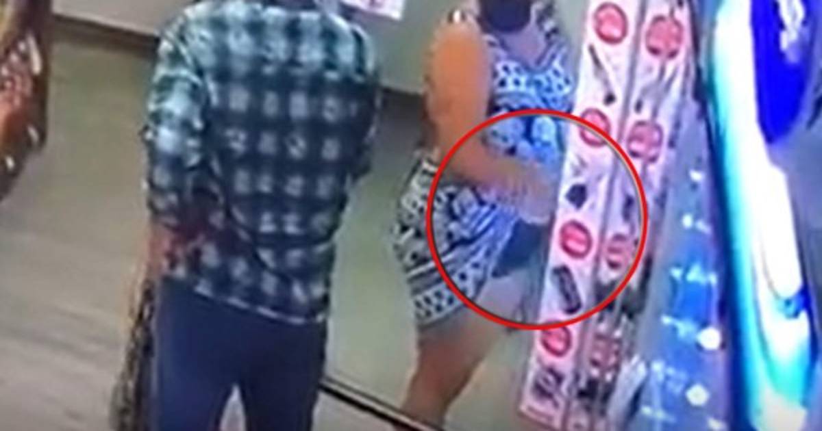 La pareja que anda con una niña saca de los exhibidores el producto y la mujer los oculta dentro en su ropa interior y en un bolso que cargaba en la parte frontal para disimular.