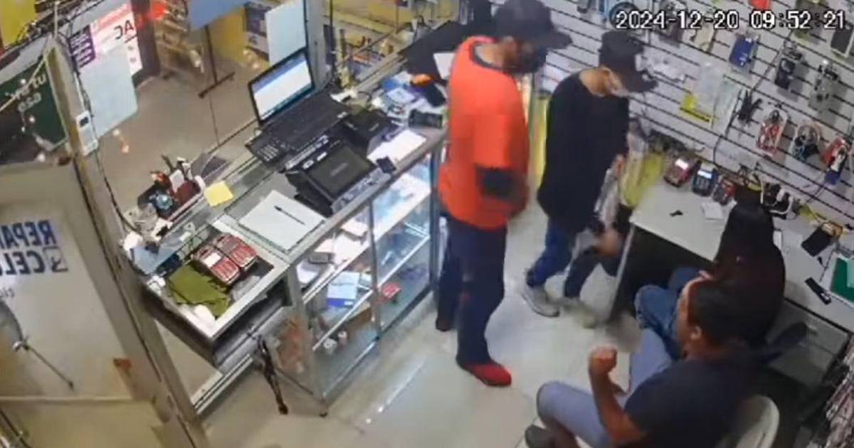 “Dame los teléfonos”, se escucha en el video de la principal cámara de seguridad del establecimiento. Otro ángulo de una cámara interior del local capta cómo los malhechores agarran los productos para llevárselos, mientras someten a los dos empleados.