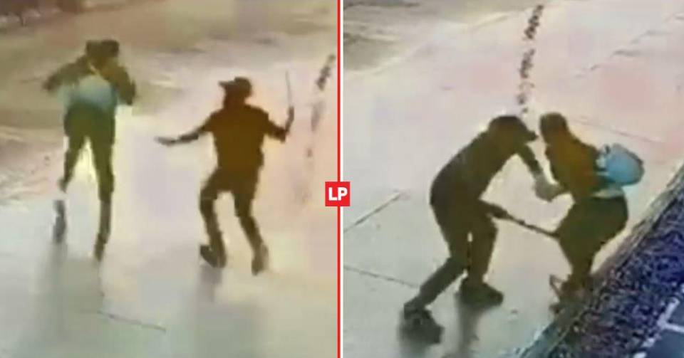 El vídeo muestra que la joven forcejea con el malhechor y él le da algunos golpes en las piernas con el arma blanca, pero la fémina se niega a entregarle la mochila que llevaba sobre su espalda.
