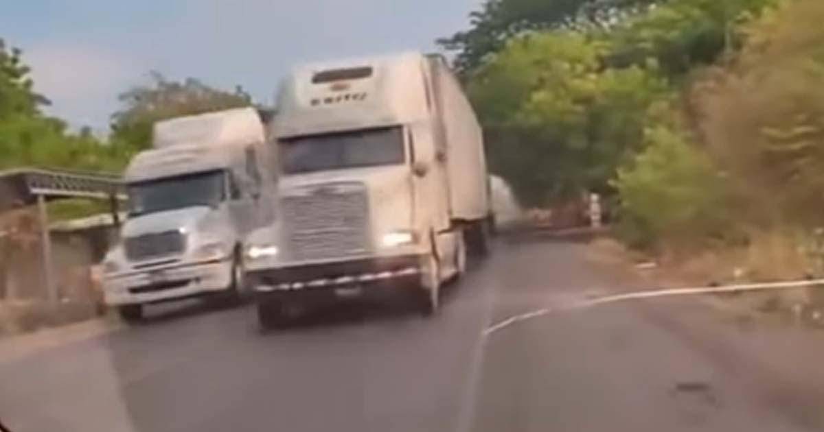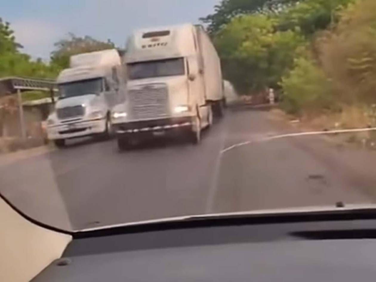 El momento exacto en el que cuatro rastras invaden ambos carriles de una carretera en Honduras, quitándole el derecho de vía a un conductor de un vehículo liviano que grabó con su teléfono.