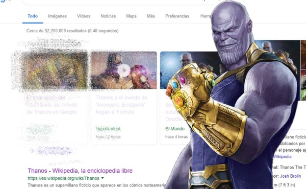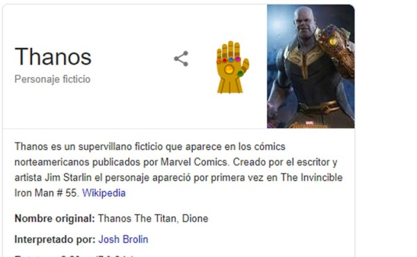 Se trata del Guantelete del Infinito de Thanos, que podemos clicar tocar para activar el último huevo de pascua en los productos de Google, tras buscar simplemente 'Thanos'. De un chasquido, desaparecerán por arte de magia la mitad de los resultados de la búsqueda.